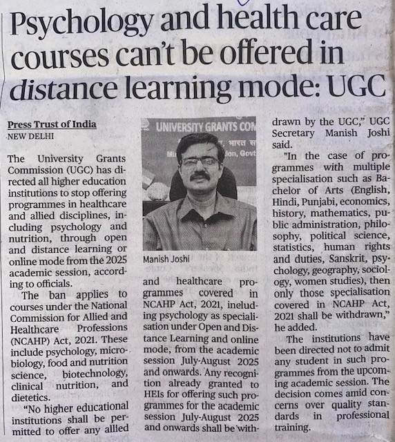 Title: Psychology and health care courses can't be offered in distance learning mode: UGC