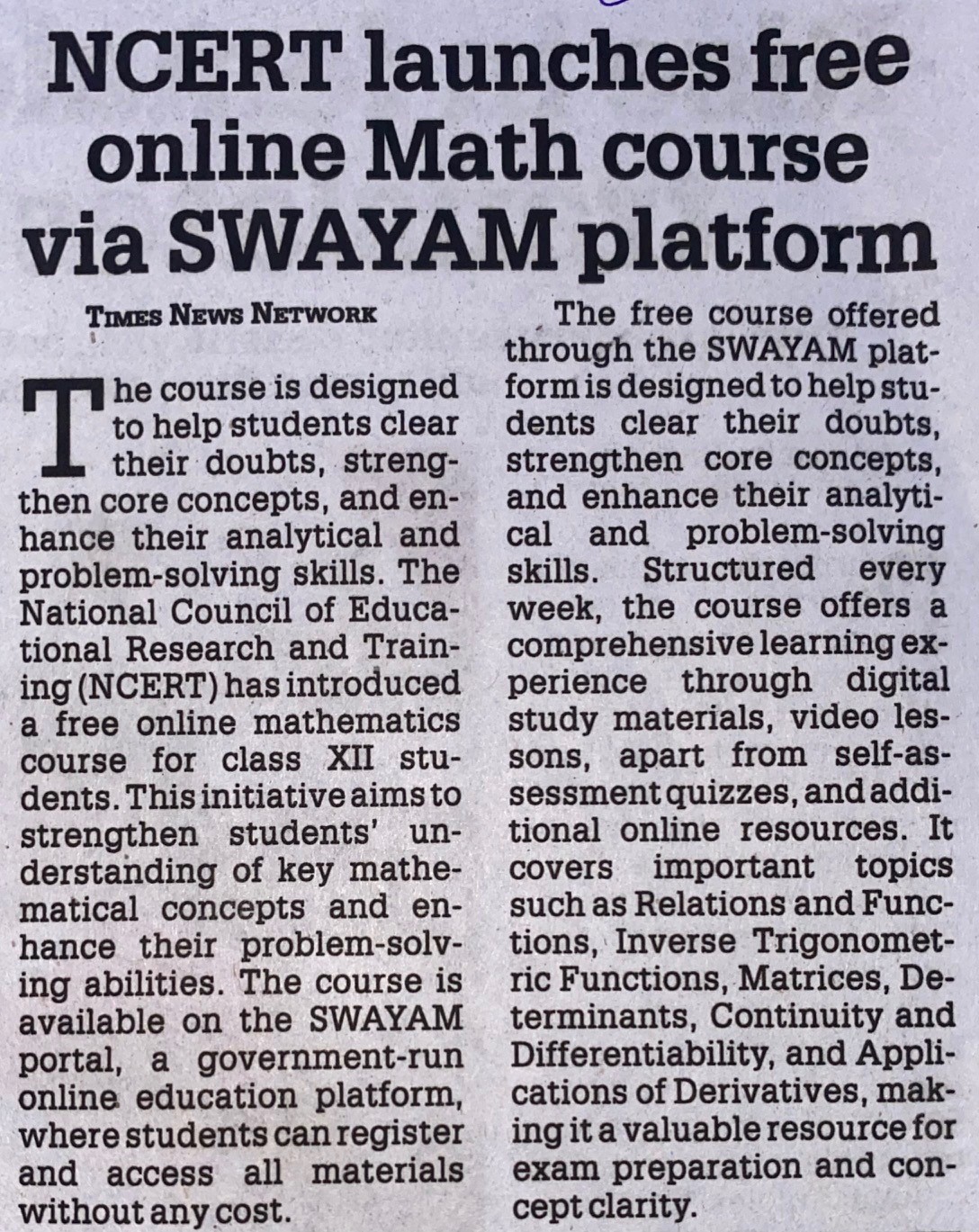 Title: | NCERT launches free online Math course via SWAYAM platform |