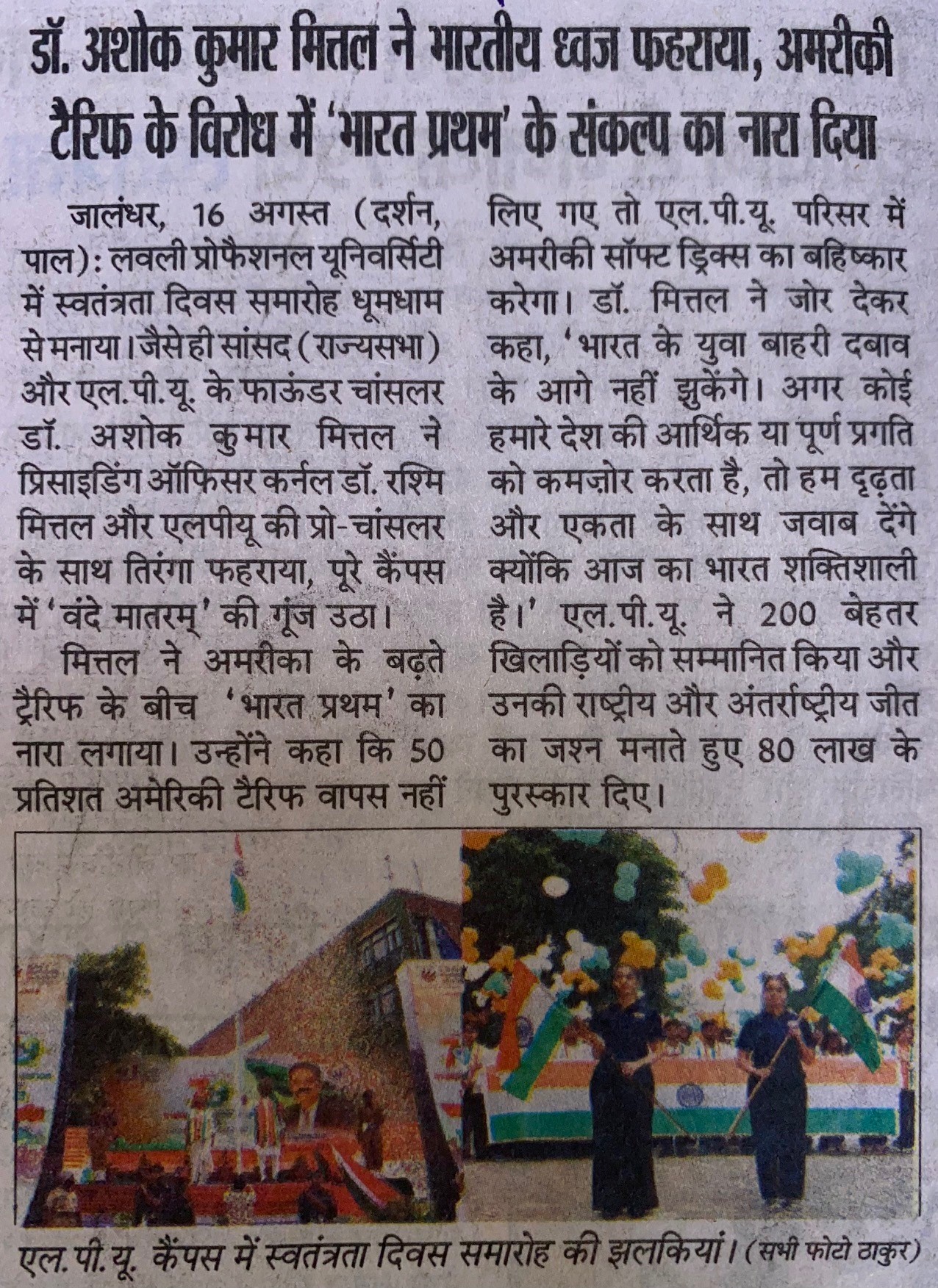 Title: | डॉ. अशोक कुमार मित्तल ने भारतीय ध्वज फहराया, अमरीकी टैरिफ के विरोध में 'भारत प्रथम' के संकल्प का नारा दिया |