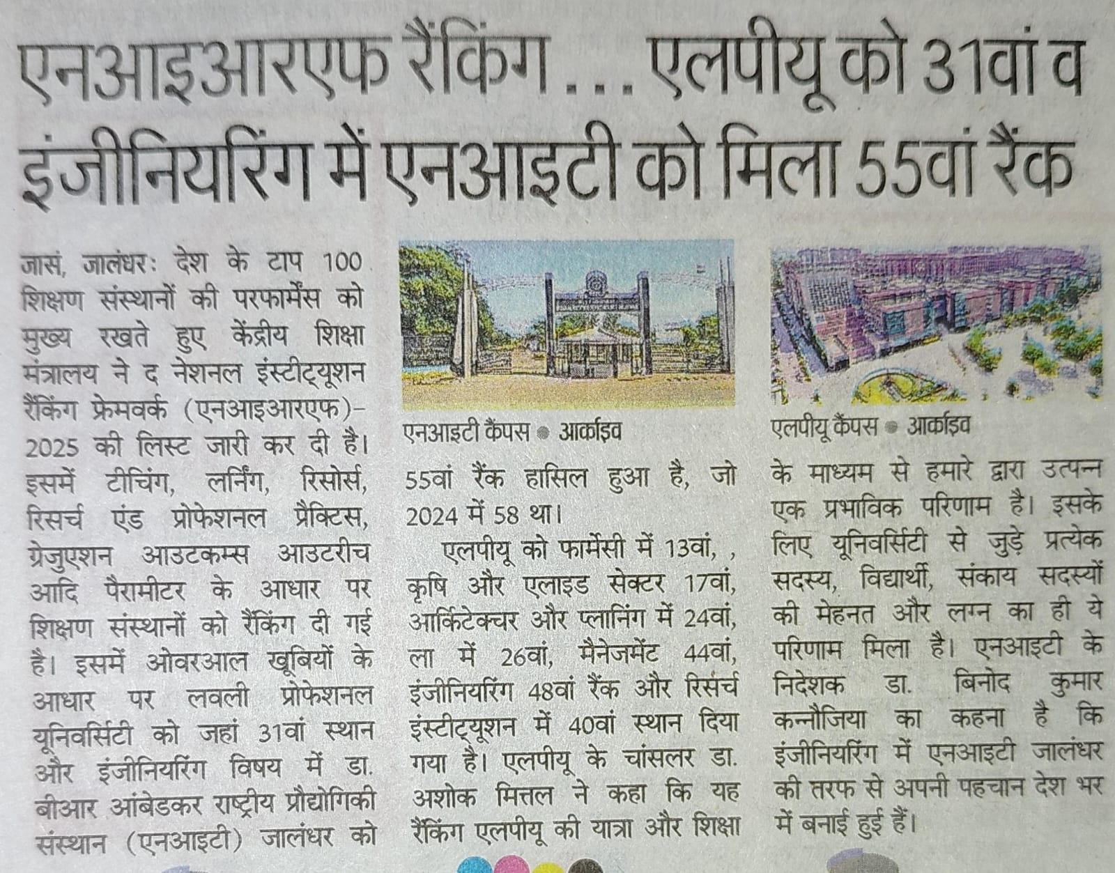 Title: एनआइआरएफ रैंकिंग... एलपीयू को 31वां व इंजीनियरिंग में एनआइटी को मिला 55वां रैंक