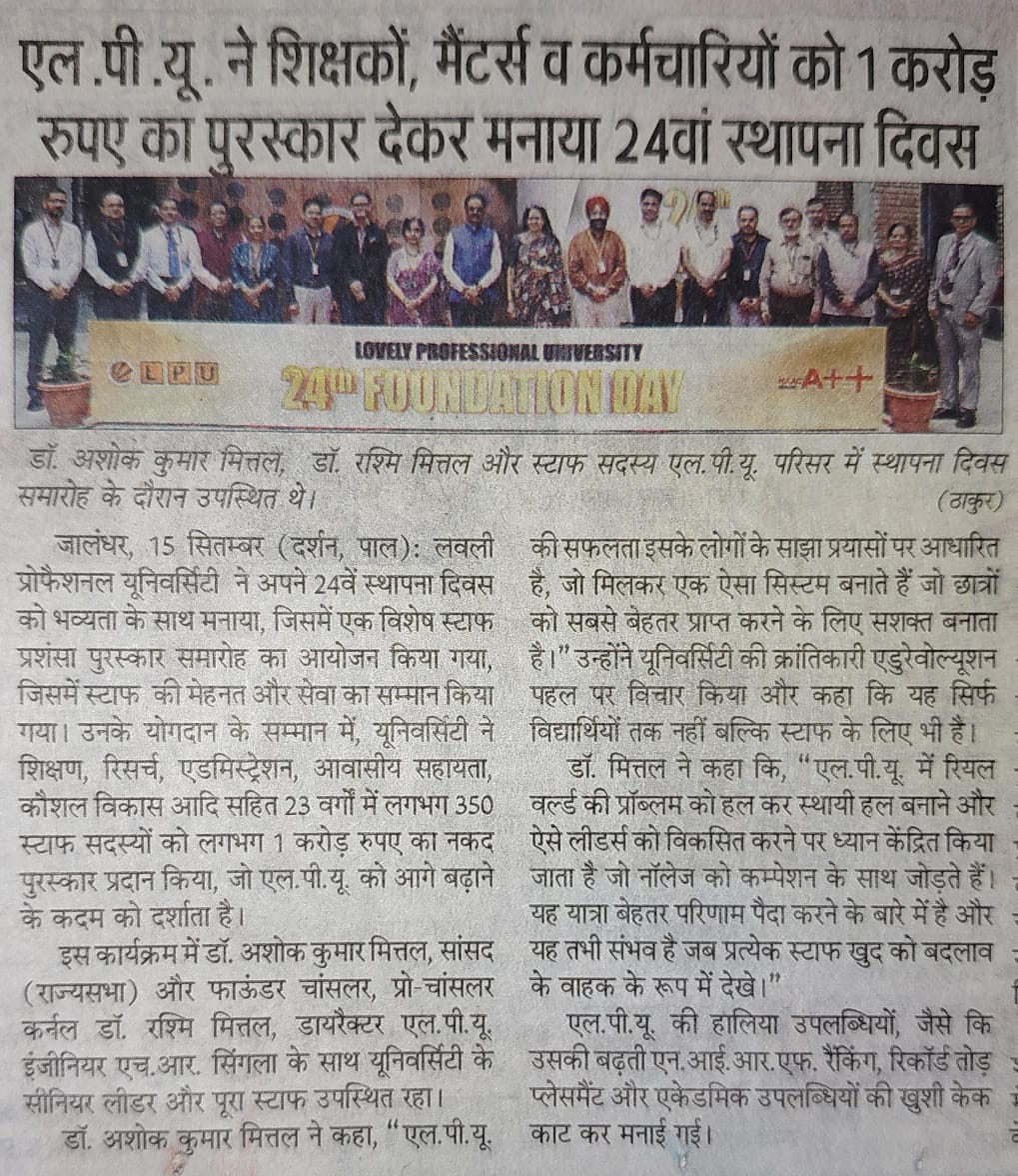 Title: एल.पी. यू. ने शिक्षकों, मैंटर्स व कर्मचारियों को 1 करोड़ रुपए का पुरस्कार देकर मनाया 24वां स्थापना दिवस