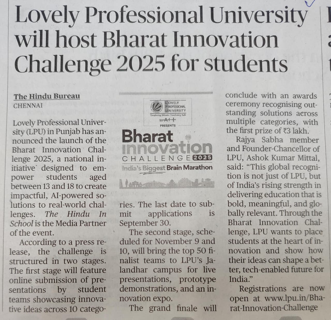 http://localhost:8080/xmlui/handle/123456789/7562| Title: | Lovely Professional University will host Bharat Innovation Challenge 2025 for students |
