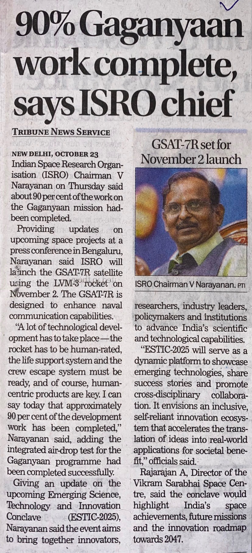 http://localhost:8080/xmlui/handle/123456789/7574| Title: | 90% Gaganyaan work complete, says ISRO chief |