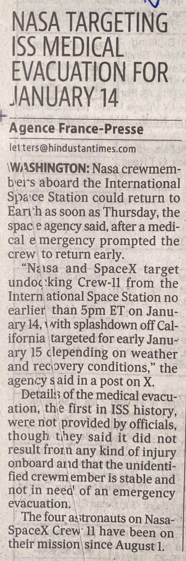 http://localhost:8080/xmlui/handle/123456789/7896| Title: | Nasa Targeting ISS Medical Evacuation For January 14 |
