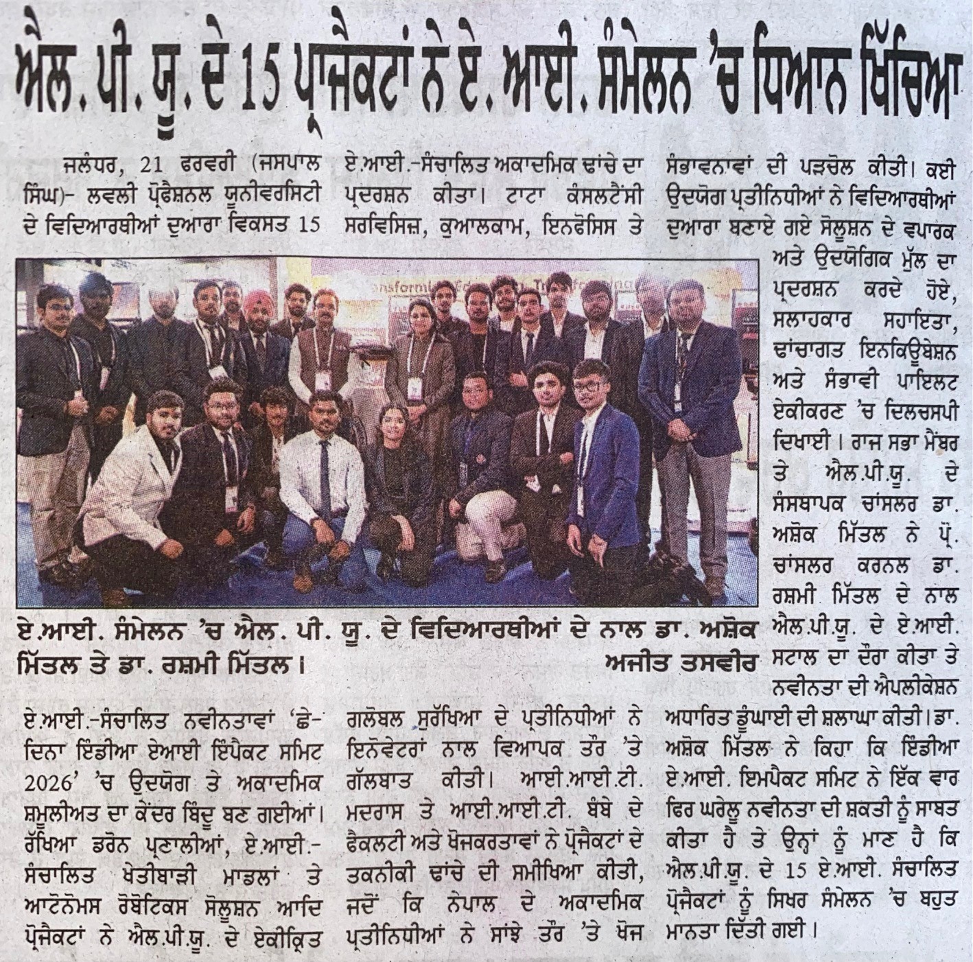 Title: ਐਲ. ਪੀ. ਯੂ. ਦੇ 15 ਪ੍ਰਾਜੈਕਟਾਂ ਨੇ ਏ. ਆਈ. ਸੰਮੇਲਨ 'ਚ ਧਿਆਨ ਖਿੱਚਿਆ