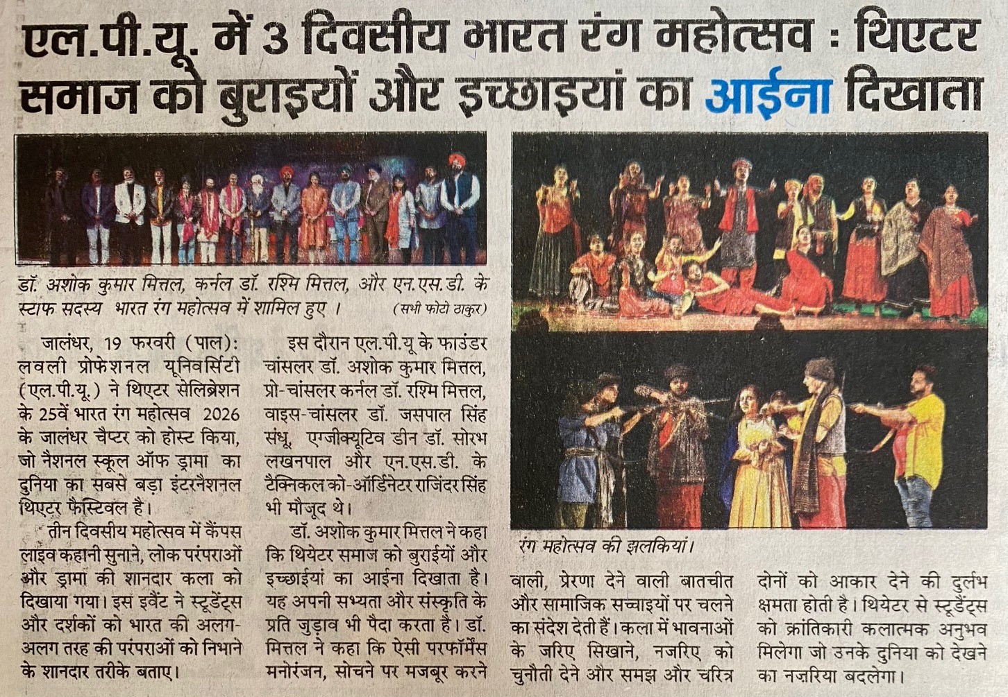 http://localhost:8080/xmlui/handle/123456789/8077| Title: | एल.पी.यू. में 3 दिवसीय भारत रंग महोत्सव : थिएटर समाज को बुराइयों और इच्छाइयां का आईना दिखाता |